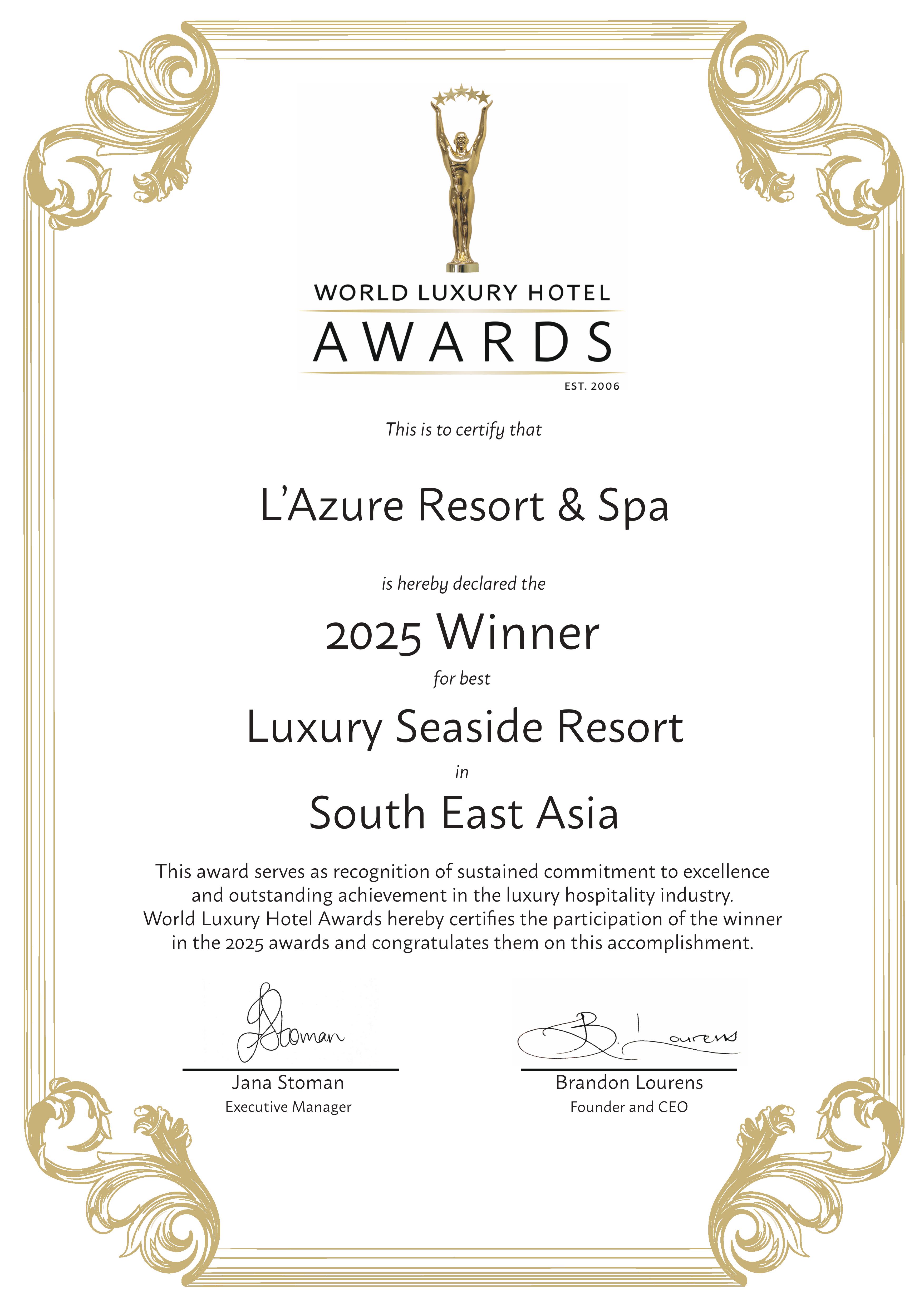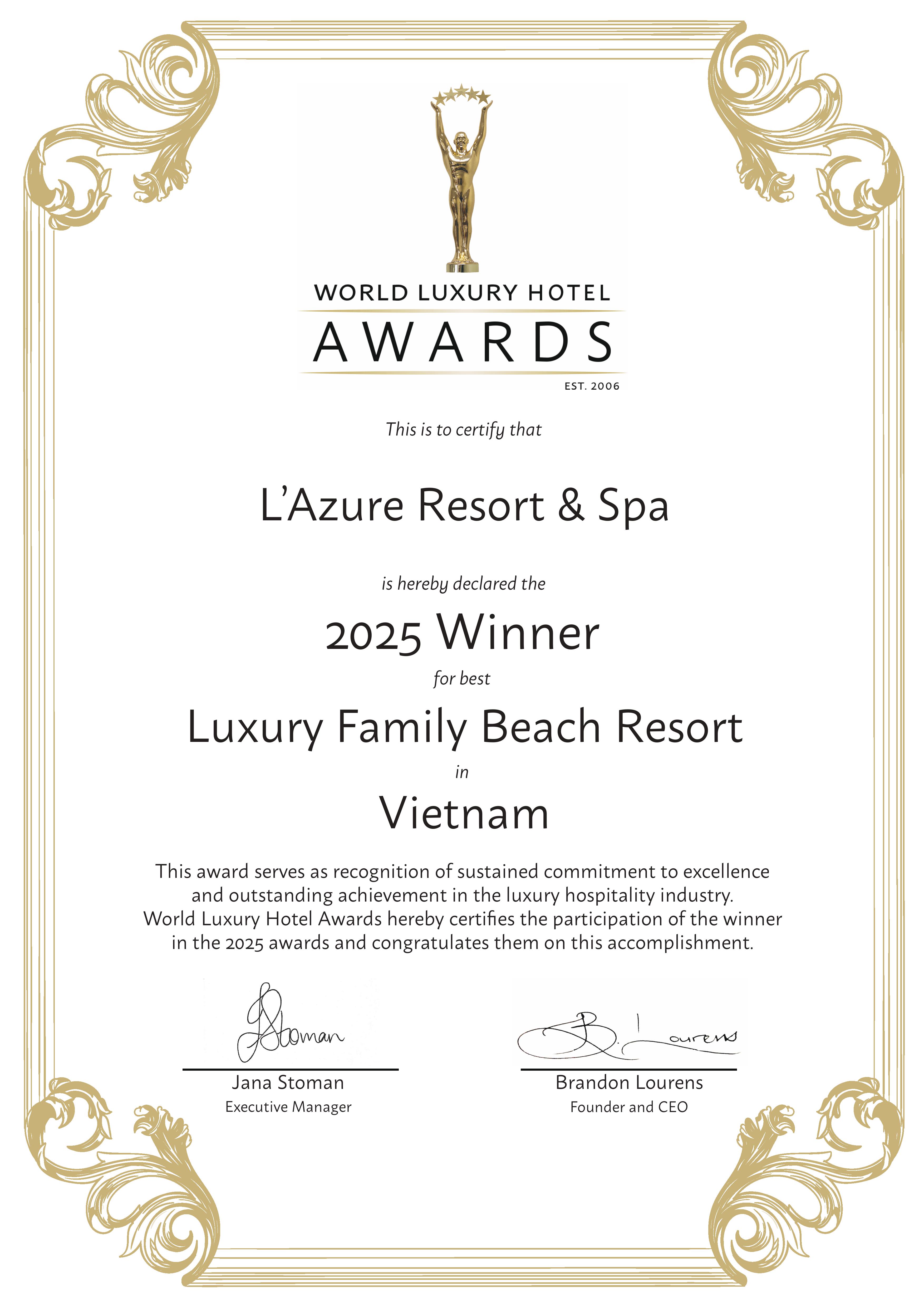 Giữa biển trời Phú Quốc, L’Azure chọn cho mình một lối đi riêng – nơi sự sang trọng không nằm ở những điều hào nhoáng, mà hiện hữu trong sự tinh tế và thấu cảm. Những danh hiệu Luxury Family Beach Resort và Luxury Seaside Resort tại World Luxury Hotel Awards 2025 L’Azure vừa được trao tặng chính là sự công nhận cho triết lý ấy.