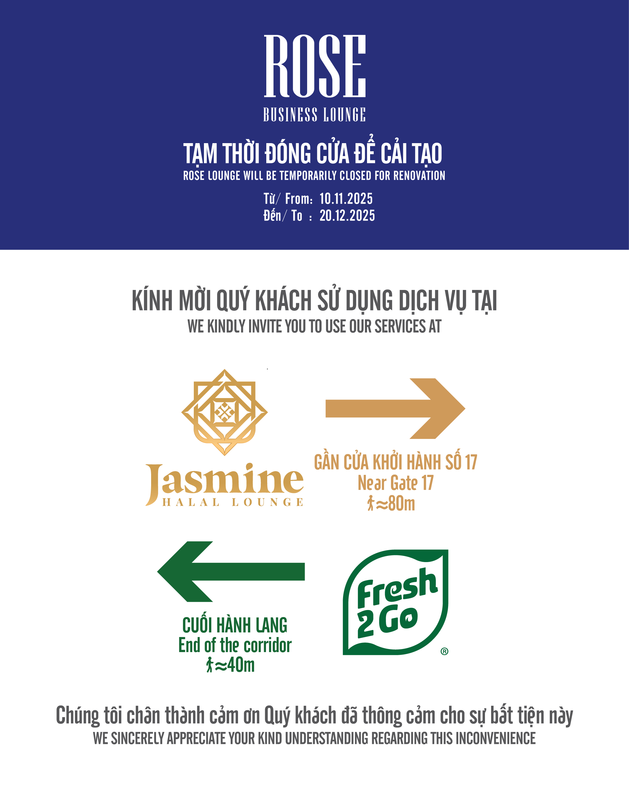 Nhằm phục vụ cho kế hoạch nâng cấp, cải tạo, ROSE Business Lounge sẽ tạm ngừng phục vụ từ 10.11.2025 đến hết 20.12.2025.