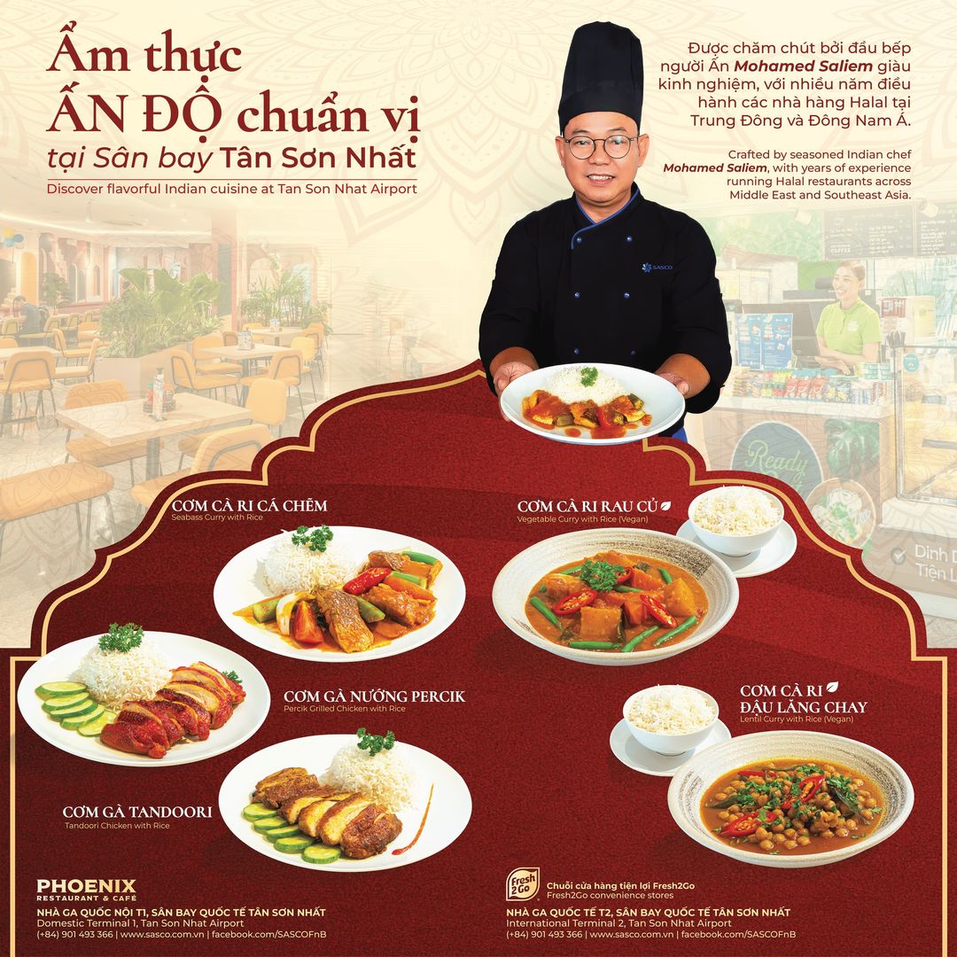 Hành khách tại Cảng Hàng không quốc tế Tân Sơn Nhất có thể thưởng thức ẩm thực Ấn chuẩn vị, được chế biến bởi đầu bếp Ấn Độ giàu kinh nghiệm và đạt chứng nhận Halal quốc tế. Đây là nỗ lực mới của SASCO nhằm mang đến trải nghiệm ẩm thực đa dạng, tiện lợi và đẳng cấp cho du khách trong hành trình bay.