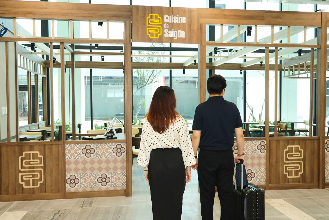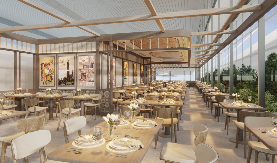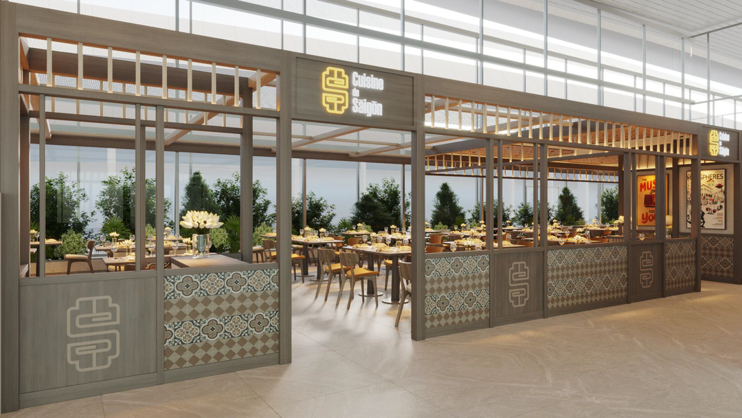 Cuisine de Saigon tại tầng 1, nhà ga T3- (175m²), nổi bật bởi phong cách Sài Gòn Retro độc đáo, nét đẹp hoài niệm được thể hiện tinh tế qua gam màu pastel nhã nhặn, họa tiết gạch bông và những ô cửa gợi nhớ Sài Gòn xưa.