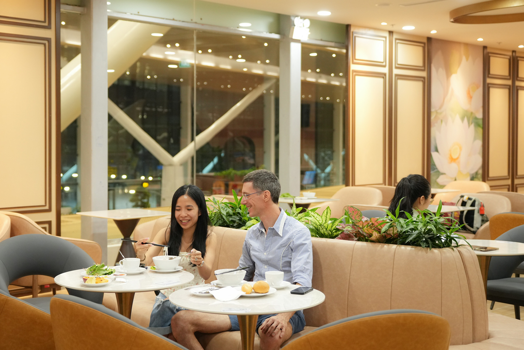 Hành khách thưởng thức ẩm thực tại phòng chờ - Ảnh: T.G