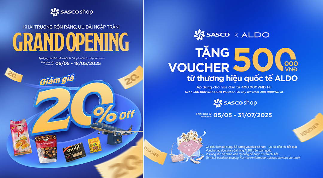(*)Áp dụng cho hóa đơn từ 400.000VNĐ trở lên tại các cửa hàng SASCO Shop, Phoenix, Cuisine De Saigon, Nhà hàng Phố Chợ, Fresh2Go, +84 Eatery ở cả Nhà ga T1 & T3). Voucher ALDO dùng được cho giày và túi nguyên giá trên toàn quốc đến hết 31/07/2025.